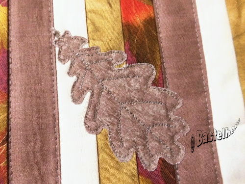 Jetzt aber zu meinem Herbst-Tischläufer (17" x 29"). Es ist eine Eigenkreation aus Reststoffen. Die Blätter sind appliziert.